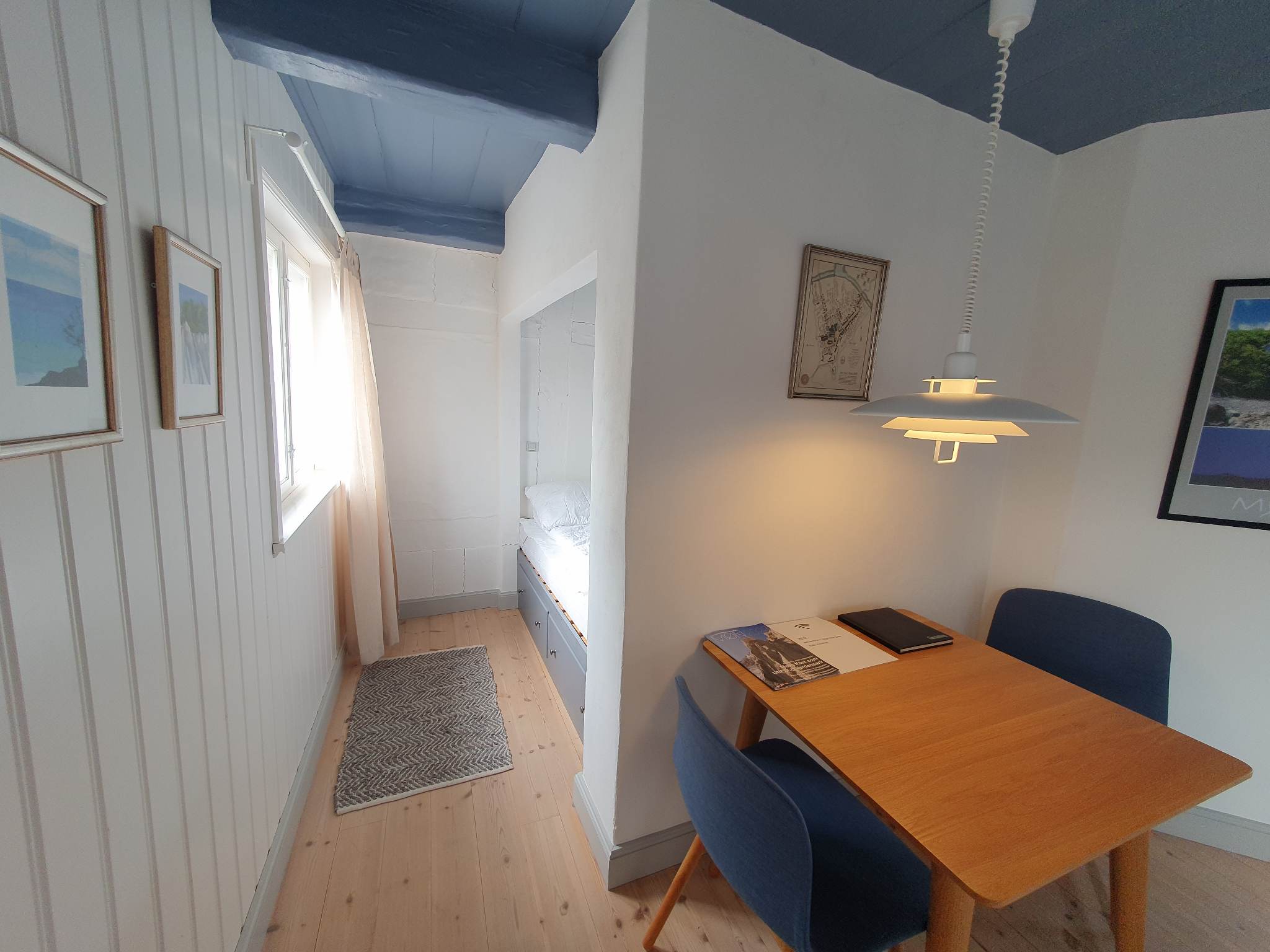 Lejligheden er indrettet med en større stue med sovesofa med chaiselong (2 pers) og spiseplads, et selvstændigt lille kammer med alkove (2 pers), køkken og bad.